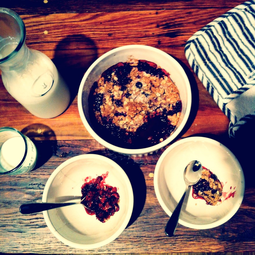 Fill the bottom of a baking dish with fresh washed berries and sprinkle the top with a 1-1 ratio of flour, rolled oats and brown sugar combined with a few tablespoons of butter and a dash of cinnamon and nutmeg. bake at 350 for about 30 mins till the berry juices are bubbling around the edges.