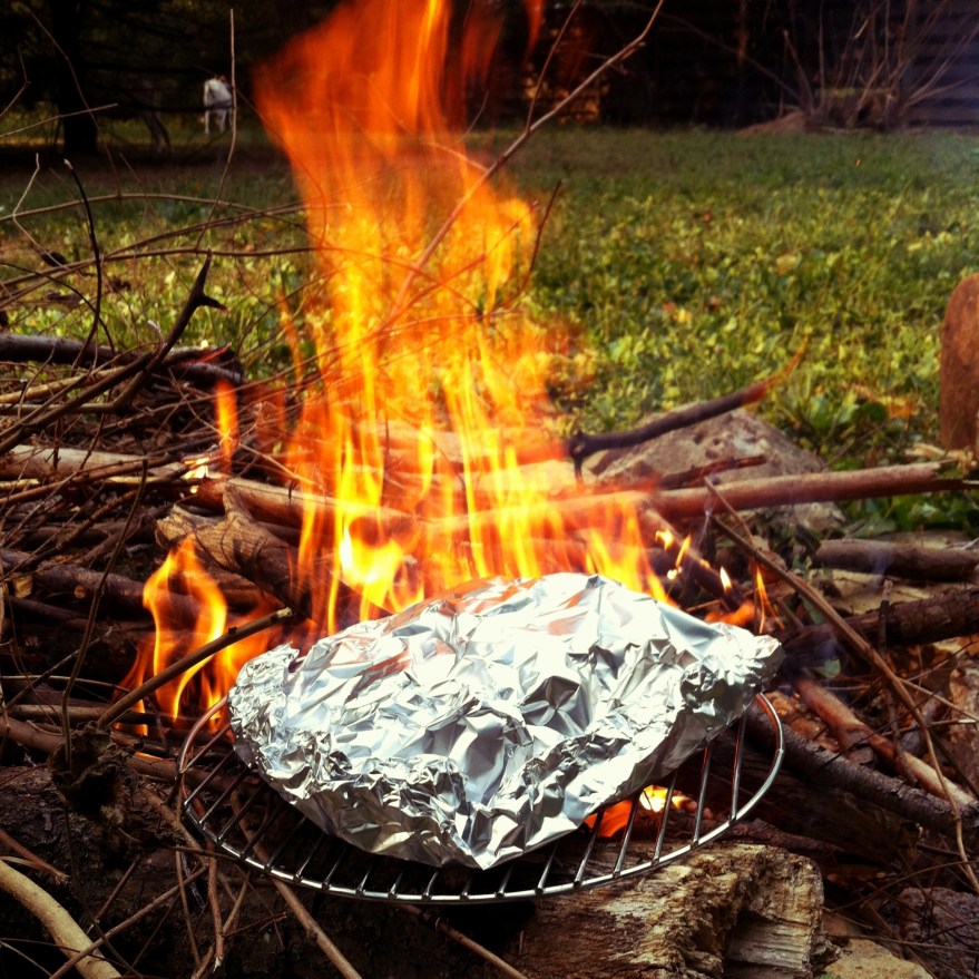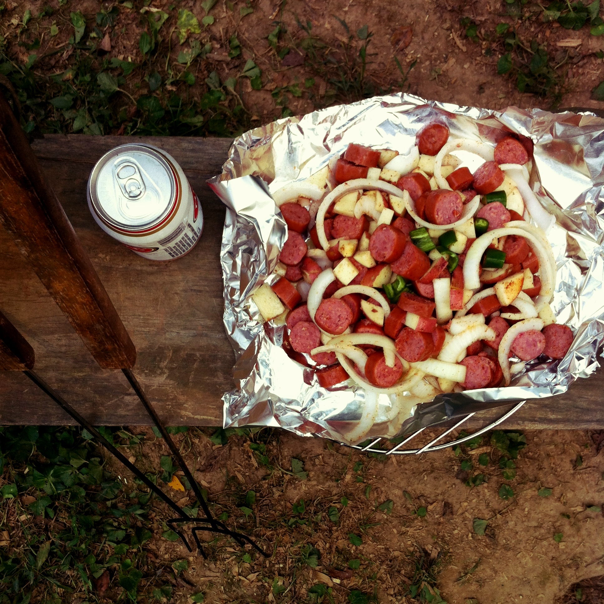 Potato + onion + beef brat hash with a few jalapenos thrown in for good measure, sprinkled with Creole and fresh ground salt dabbed with a little butter and thrown over some hot coals. Cooks in a flash. So good.